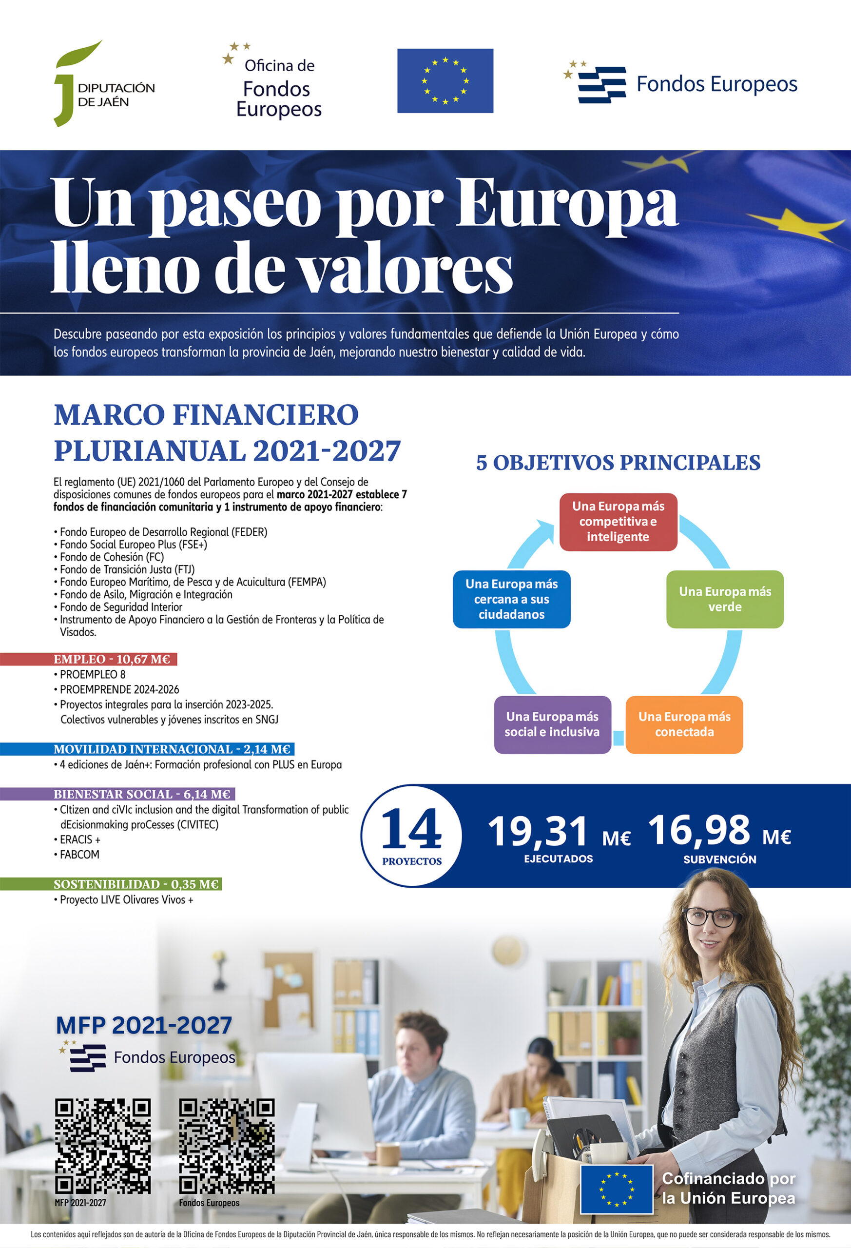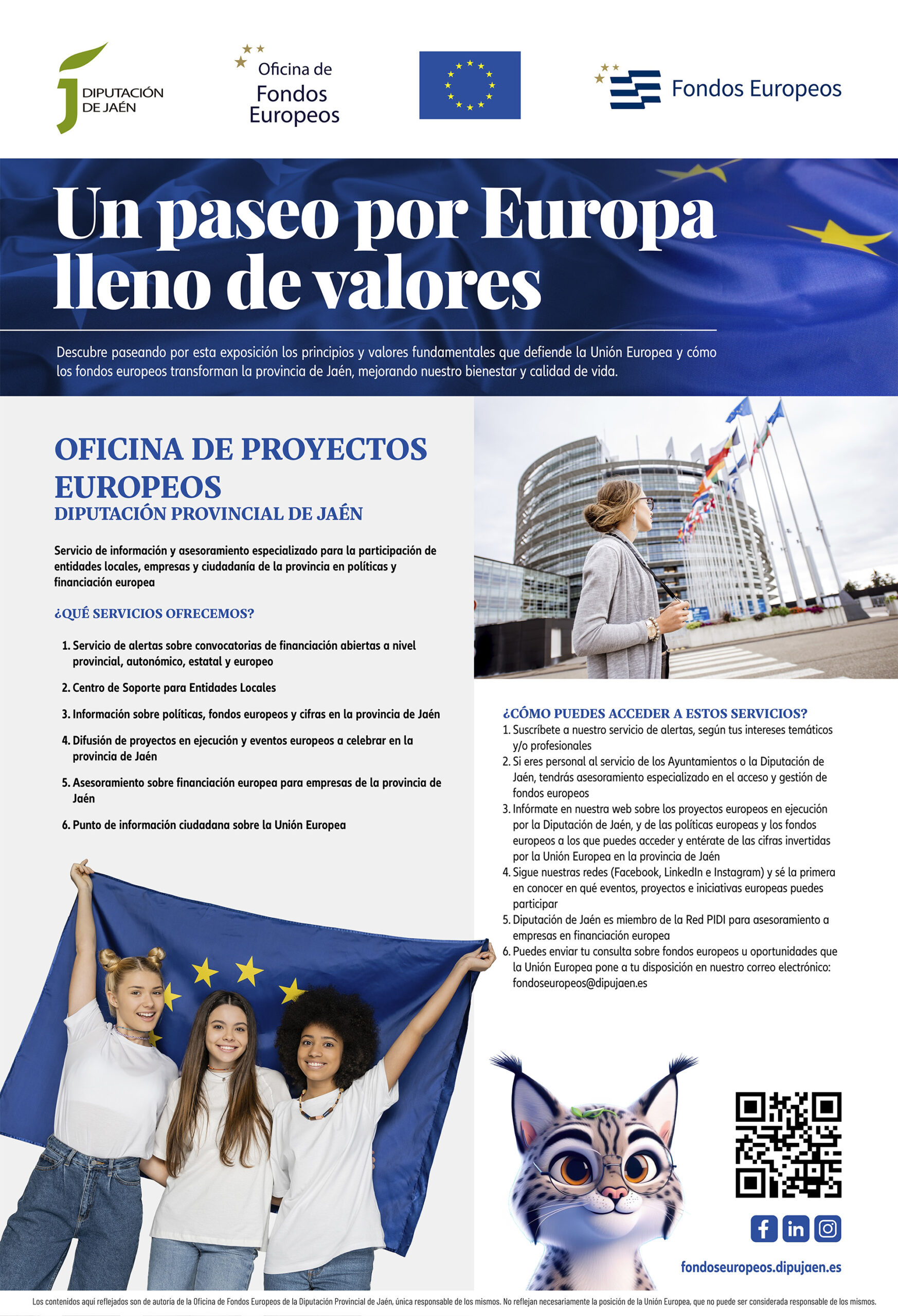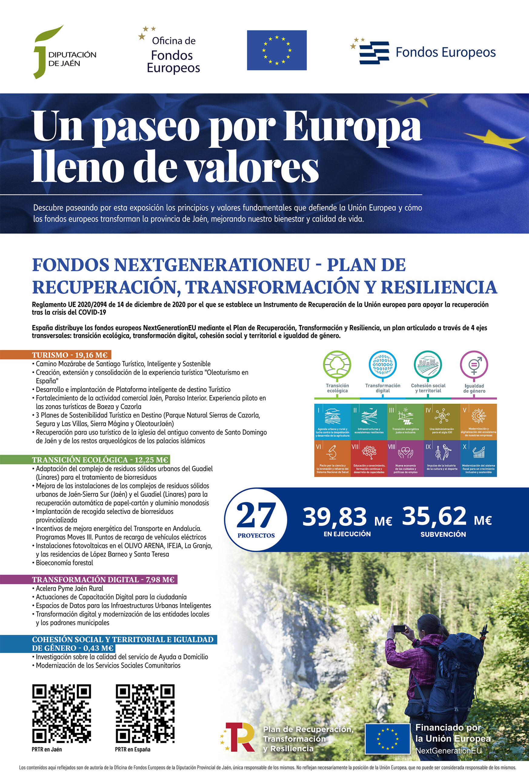 Descubre paseando por esta exposición virtual los principios y valores fundamentales de la Unión Europea y como los fondos europeos transforman la provincia de Jaén, mejorando nuestro bienestar y calidad de vida.